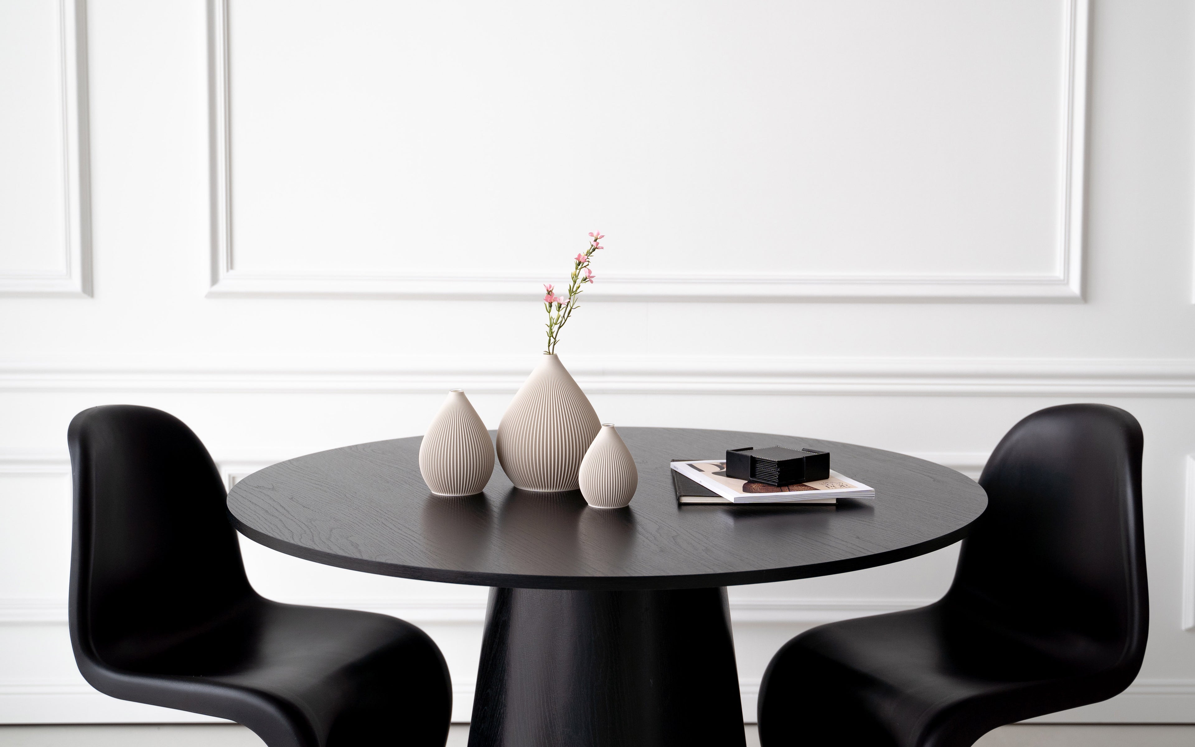 The bulbous shape and the elegant, timeless ripple design allow for versatile combinations with other vases and decorative elements, adding a special touch to any setting. The narrow opening perfectly showcases long-stemmed flowers or ornamental grasses.