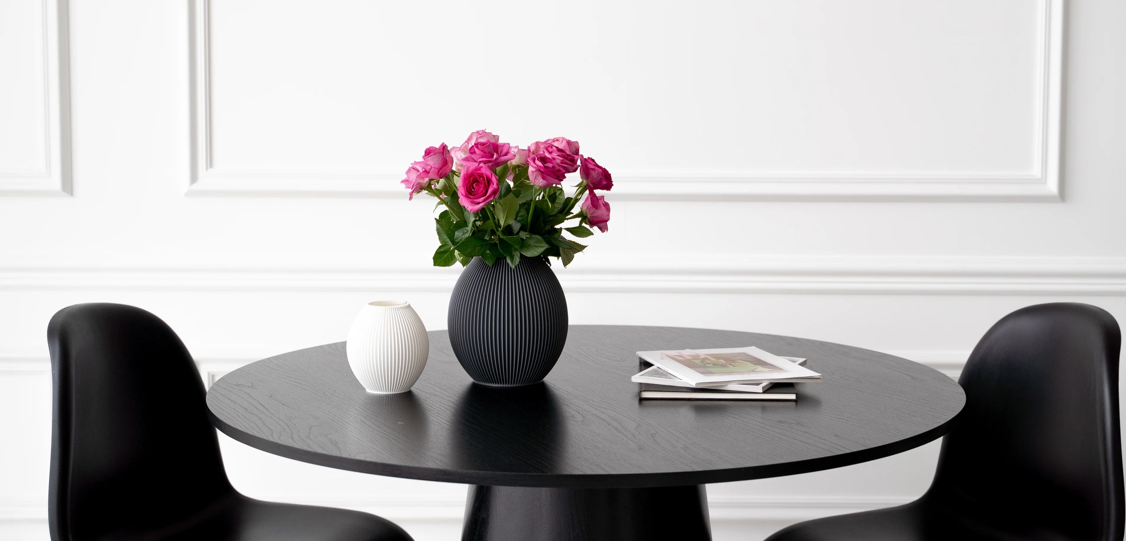 The Poke Vase features organic lines that harmoniously vary in width. With its timeless ripple-effect design, the oval-shaped Poke impresses and becomes an emblem of classic elegance. The large opening of the vase provides ample space for numerous types of bouquets and is perfectly suited to accompany all kinds of flower arrangements.